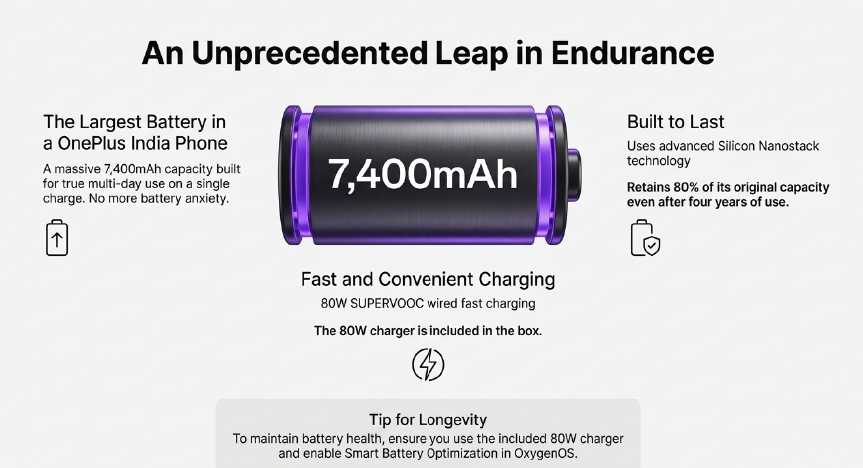 We are introducing a massive 7,400mAh battery, the largest ever featured in a OnePlus phone in India. This is the cornerstone of our “multi-day use” marketing message. The integration of Silicon Nanostack technology, which guarantees the battery retains 80% of its capacity after four years, adds a powerful long-term value argument. The device ships with an 80W SUPERVOOC wired charger included in the box, ensuring rapid refueling.
