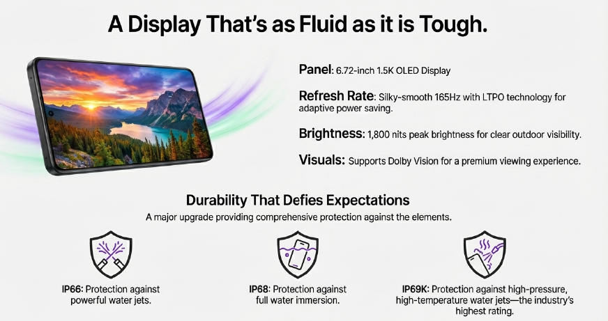 The display elevates the R-series with a true flagship-tier viewing experience, featuring a 6.72-inch 1.5K OLED panel with a hyper-smooth 165Hz adaptive refresh rate (LTPO), Dolby Vision support, and 1,800 nits of peak brightness. Furthermore, we have made a major upgrade in durability by securing IP66, IP68, and IP69K ratings. This provides customers with comprehensive protection against dust, full water immersion, and high-pressure water jets, establishing a new standard for resilience in this price category and offering a significant competitive advantage.